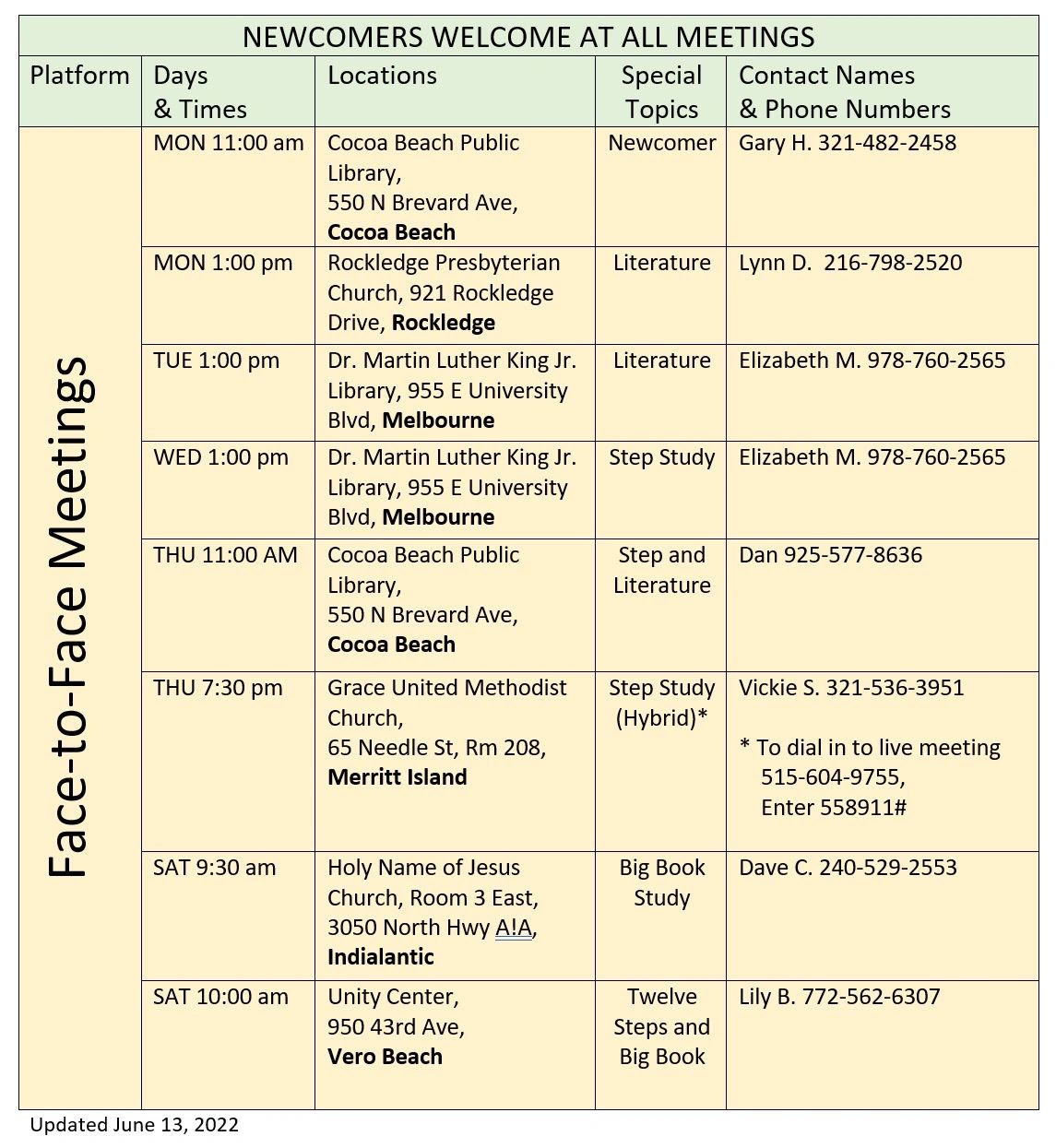 Face-to-Face Meetings Special Focus. Ad Search Oa Telephone Meetings. Contact the meeting rep if you have questions and to confirm that the meeting is still active.